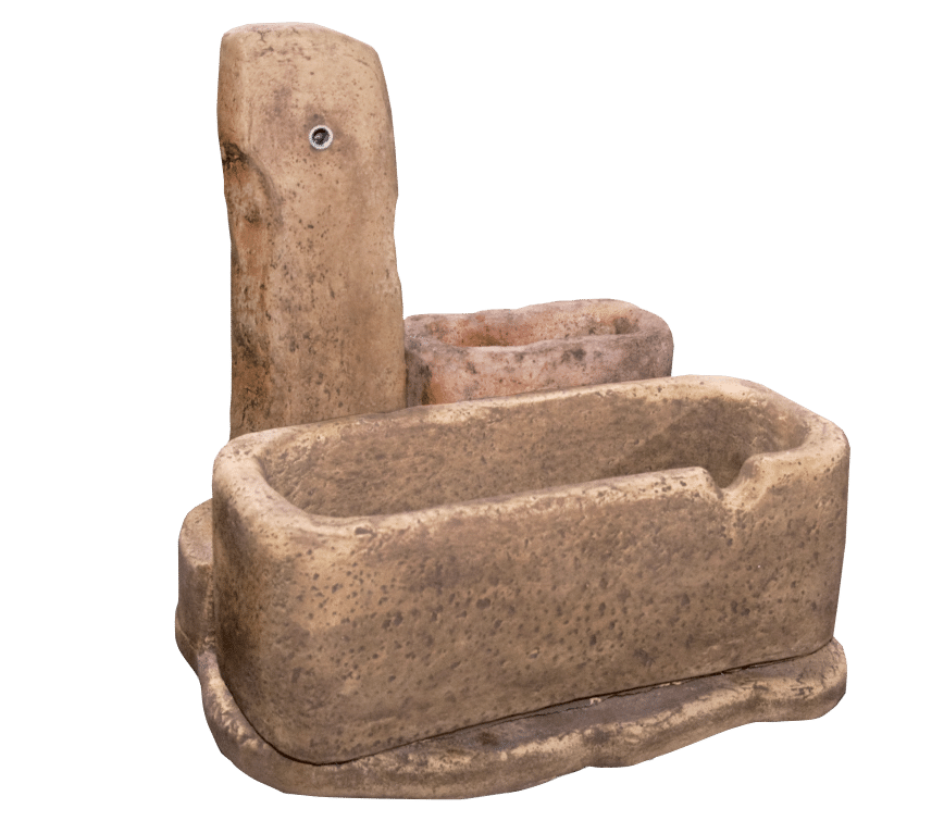 Česma Č-19 ima prirodan, rustičan izgled koji savršeno odgovara eksterijerima inspirisanim prirodom. Njena gruba tekstura i nepravilni oblici čine je savršenim dodatkom za pejzaže koji teže prirodnom, neformalnom izgledu. Visok stup i prostrane posude S-244 i S-264 omogućavaju lako korištenje, dok izdržljiva betonska konstrukcija garantuje dugotrajnost, otpornost na vremenske uslove i jednostavno održavanje. Ova česma donosi posebnu atmosferu i funkcionalnost svakom prostoru, bilo da se radi o vrtu, parku ili rustičnom eksterijeru.