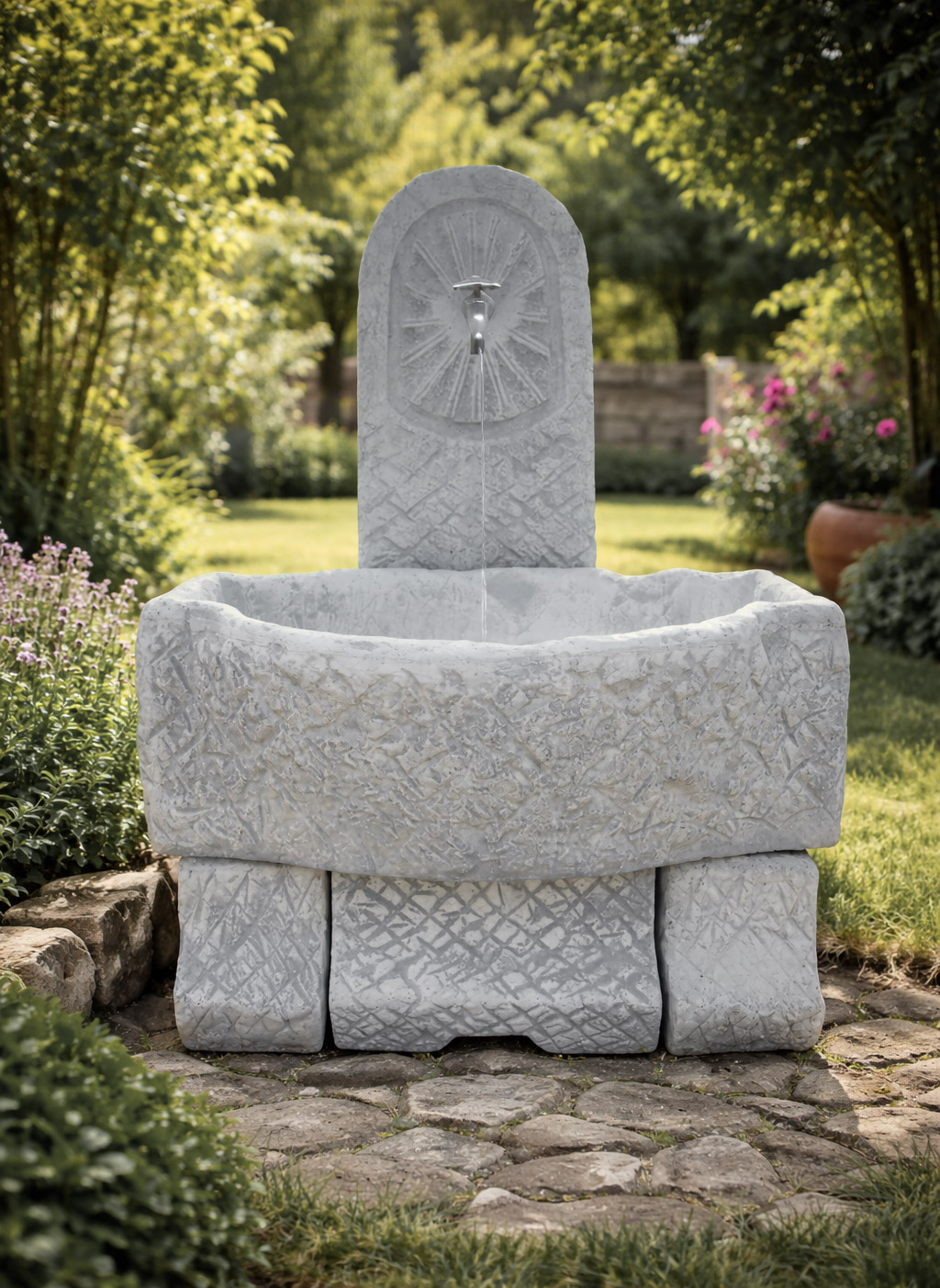 Česma Č-3 izrađena je od kvalitetnog betona s prepoznatljivim reljefnim uzorkom koji odiše rustikalnim šarmom. Njen klasičan dizajn savršeno se uklapa u raznolike eksterijere, bilo da je riječ o dvorištu, vrtu ili javnim površinama. Poseban dodatak je korito česme, koje ne služi samo kao funkcionalan element, već se po želji može koristiti i kao saksija S-110, čineći je idealnim spojem praktičnosti i dekoracije.