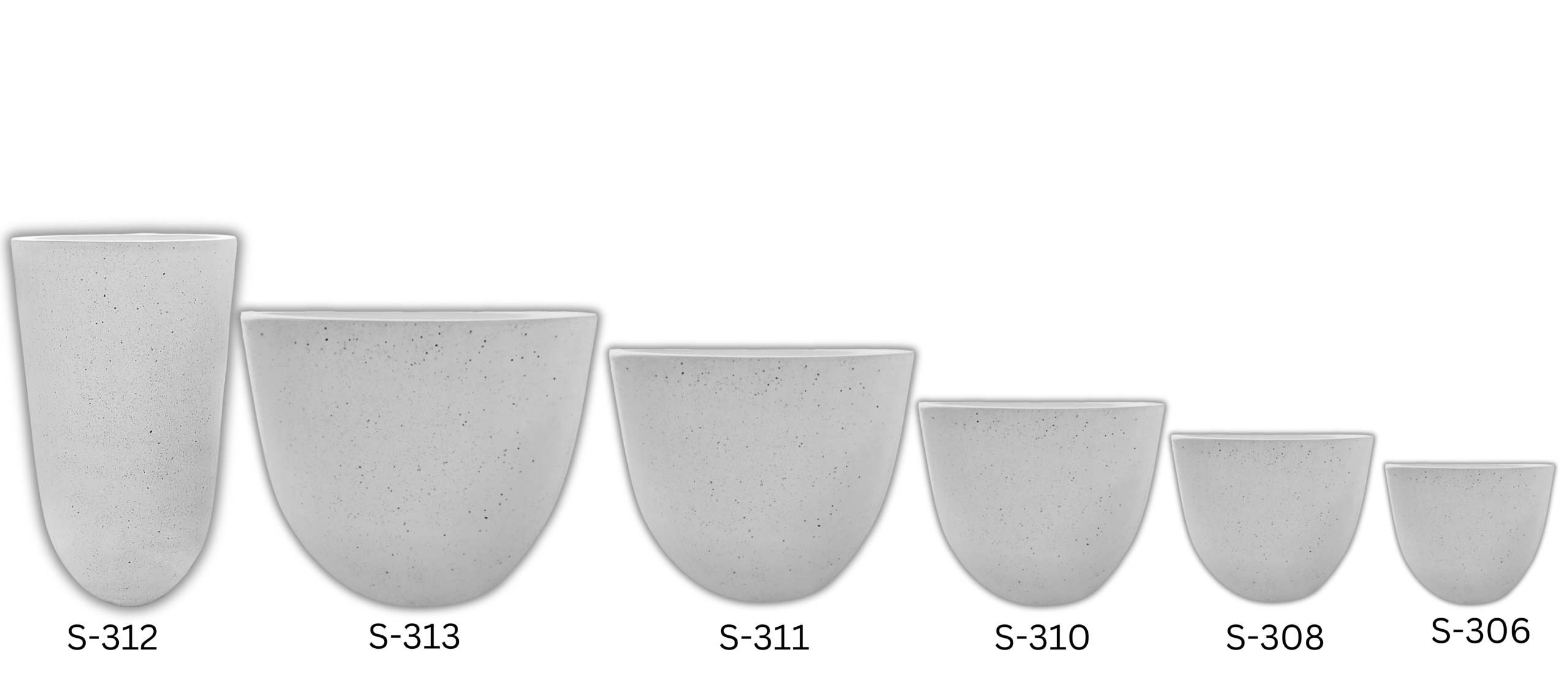 Saksije iz linije S-306, S-308, S-310, S-311, S-312 i S-313 karakterišu se zaobljenim oblicima i elegantnim dizajnom koji pruža savremeni izgled bilo kojem eksterijeru ili interijeru. Njihov jednostavan, ali sofisticiran dizajn omogućava svestranost u kombinovanju sa različitim stilovima uređenja, dok tekstura na površini dodaje dimenzionalnost i atraktivnost. Neutralne boje, kao što su bijela, bež i crna, čine ove saksije idealnim izborom za različite biljne aranžmane, naglašavajući njihovu prirodnu ljepotu.