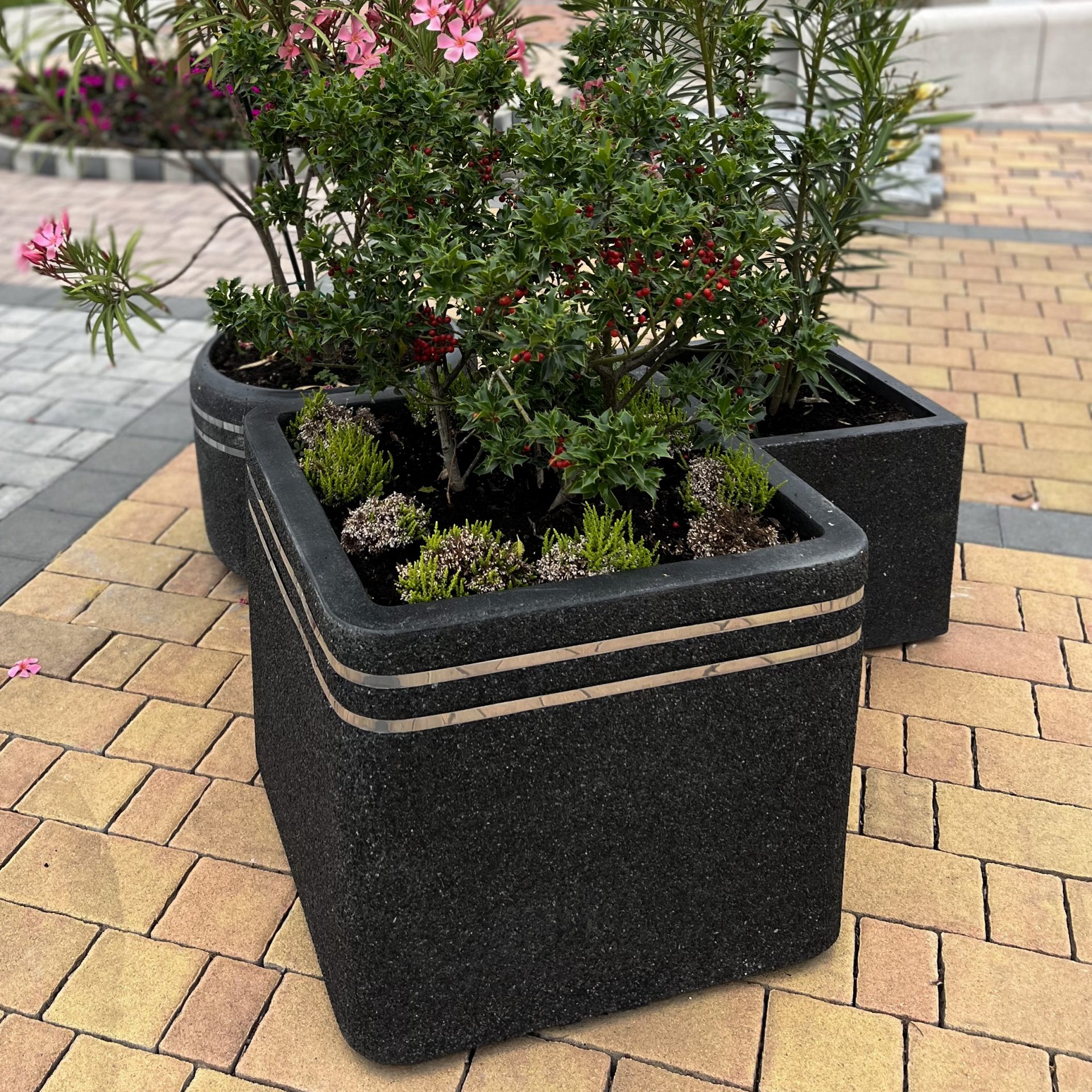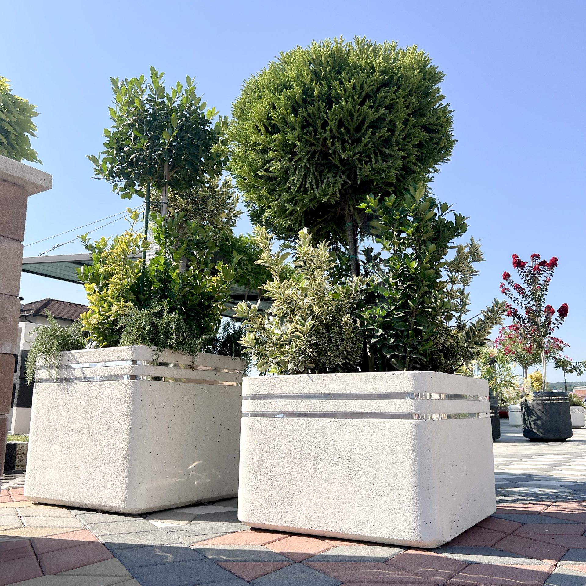 Ove kvadratne betonske saksije kombinuju modernu estetiku sa funkcionalnošću. Inox detalji sa strane dodaju im dozu elegancije, dok njihov jednostavan dizajn omogućava lako uklapanje u različite tipove prostora, bilo da se radi o dvorištu, terasi ili poslovnom eksterijeru. Saksije su dostupne u nekoliko veličina i boja, a izrađene su od izdržljivog betona, čineći ih otpornim na spoljne vremenske uslove. Saksija S-367/371/369/370/364/365/366 kvadratnih formi je idealna za veće biljke i doprinosi urednom i minimalističkom izgledu prostora.